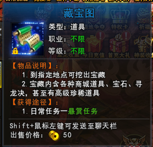 1. 与普通藏宝图的寻宝方式一样,要到指定的地点挖宝,但挖出来的物品奖励更高。